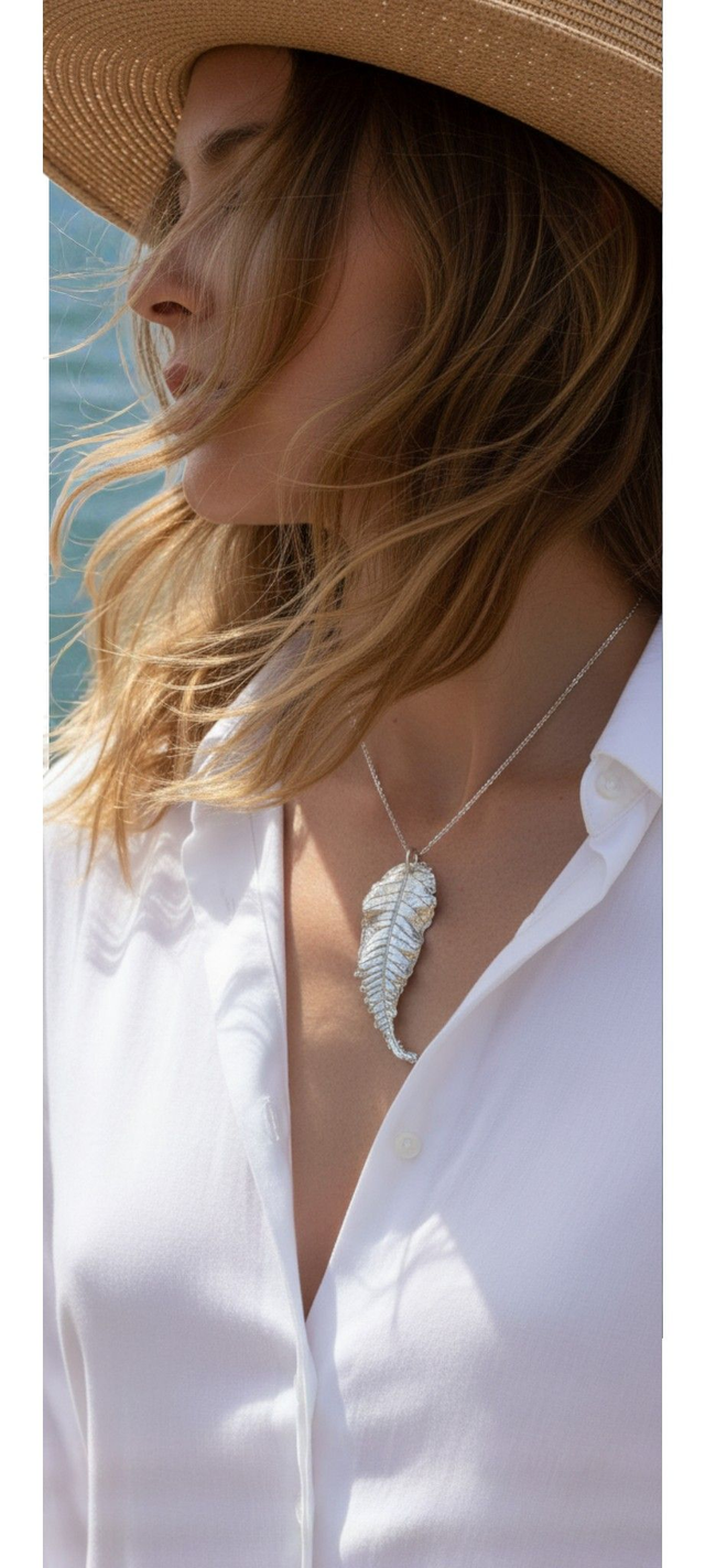 This exquisite statement Leaf Pendant is crafted from fine silver to capture the delicate beauty of nature. Inspired by the intricate veins and organic shapes of real leaves, this jewellery piece blends elegance, boldness and a touch of the outdoors. Perfect as a standout accessory, it complements both casual and formal outfits, adding a sophisticated yet natural flair. Handmade with attention to detail, it promises lasting shine and timeless appeal. Embrace the essence of nature and make a bold fashion statement with this stunning silver leaf pendant.