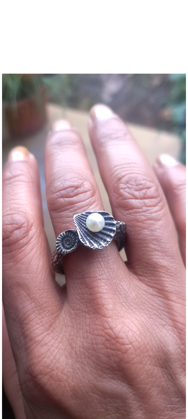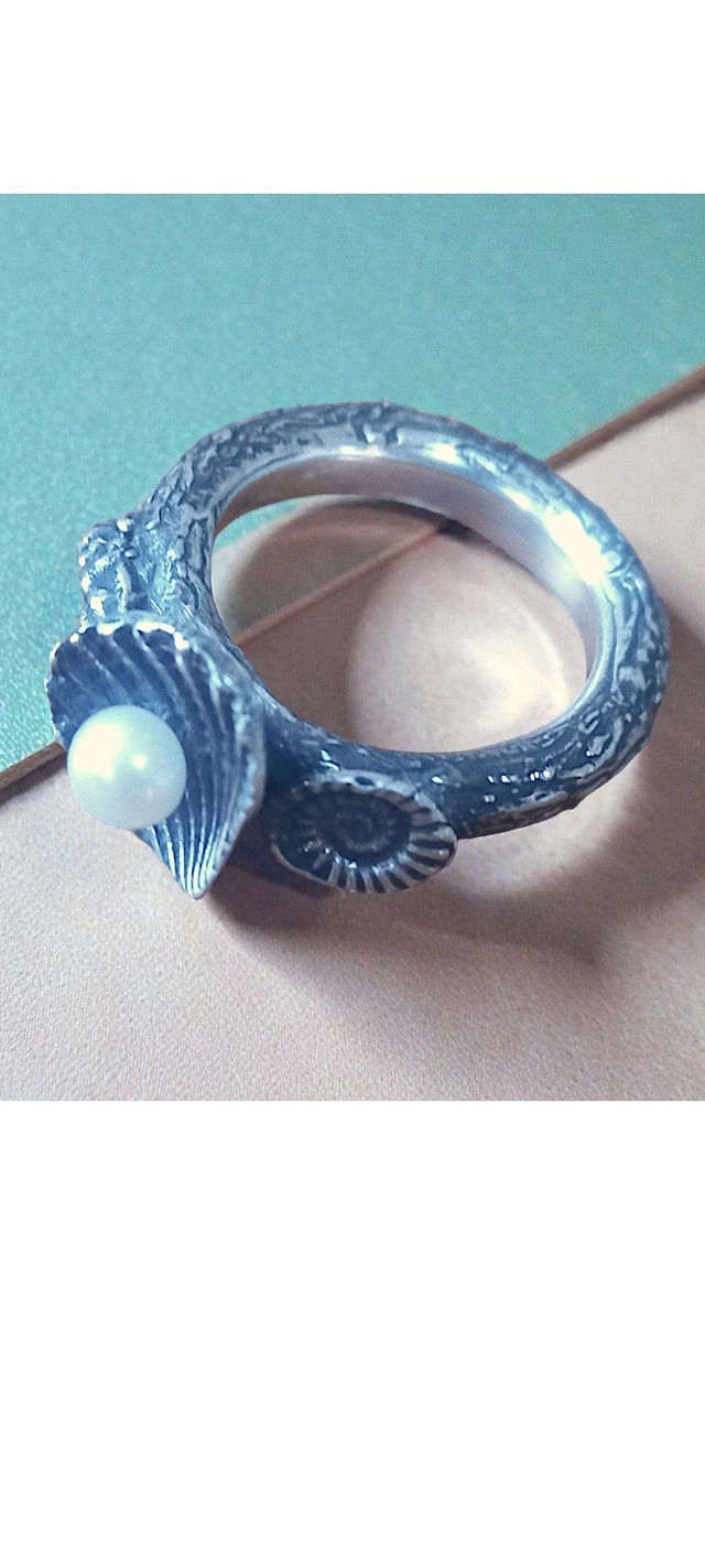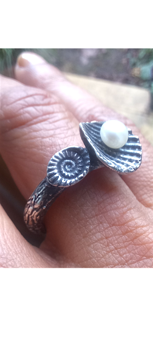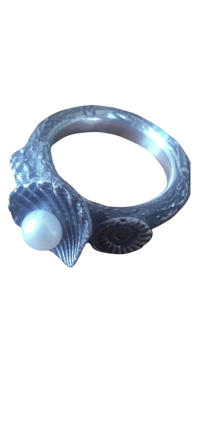 This chunky fine silver ring is beautifully textured to capture the essence of nature and sea life. Featuring exquisite pearl and shell embellishments, this statement piece combines organic elegance with bold craftsmanship. Textured and embelished on the outside, it has a smooth finish inside for a comfortable wear. Perfect for those who love unique jewellery inspired by the ocean, the ring adds a sophisticated touch to any outfit. Its durable fine silver construction ensures lasting shine and comfort, making it an ideal everyday accessory or a thoughtful gift for nature and sea-inspired jewellery lovers. Embrace the beauty of the sea with this eye-catching, textured ring designed to stand out.