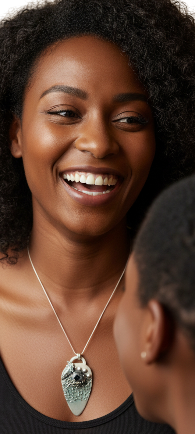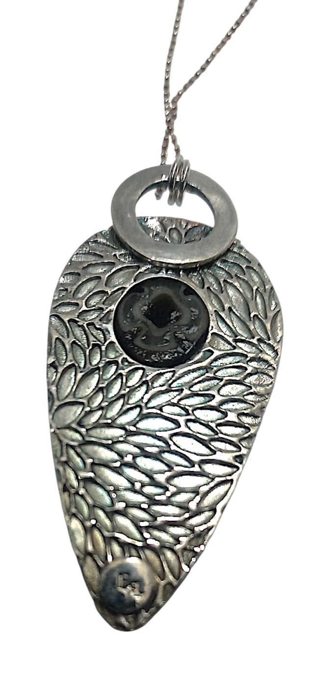 Chunky Murano Glass necklace, crafted to perfection with delicate silver lace-like accents. Featuring a stunning, hand-blown Murano glass, this accessory beautifully contrasts the black and white of the glass with the intricate patterns of the silver, reminiscent of delicate lace artistry.