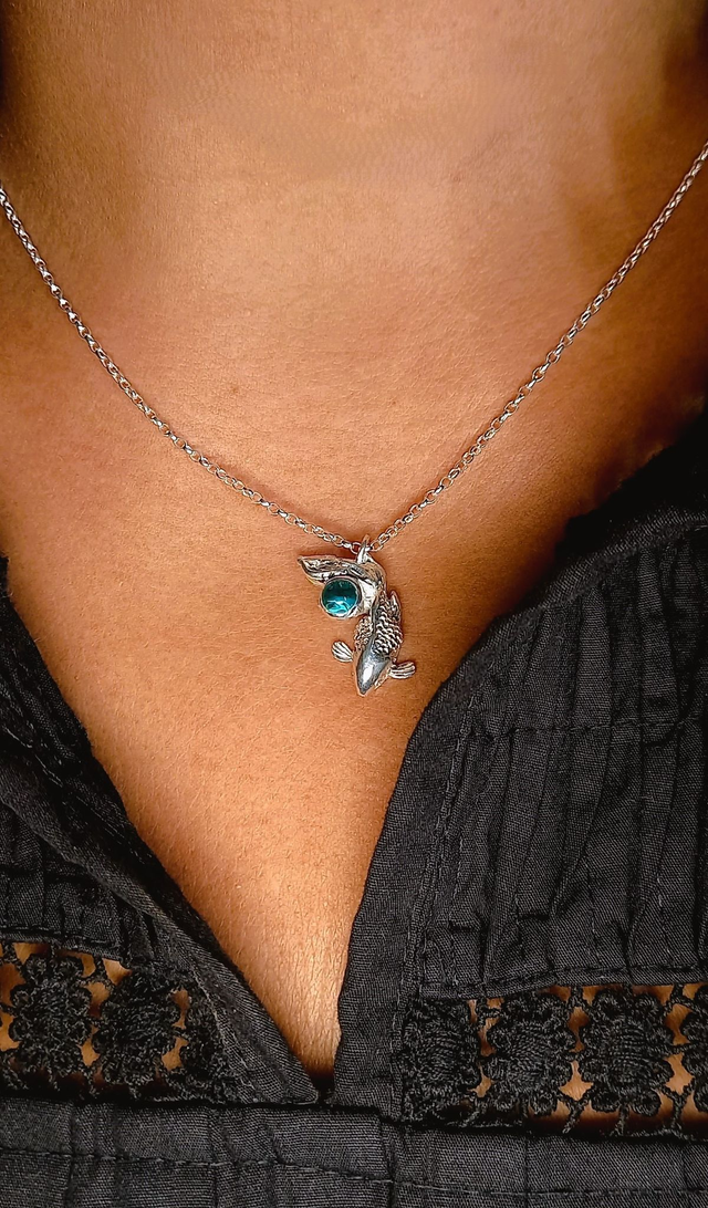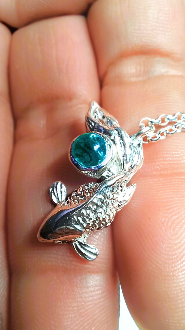 A tiny, intricately detailed silver koi pendant paired with emerald-toned Murano glass that catches the light like water in motion. The textured scales shimmer, the silver gleams, and the glass glows from within — a breathtaking play of detail and light in one graceful piece.